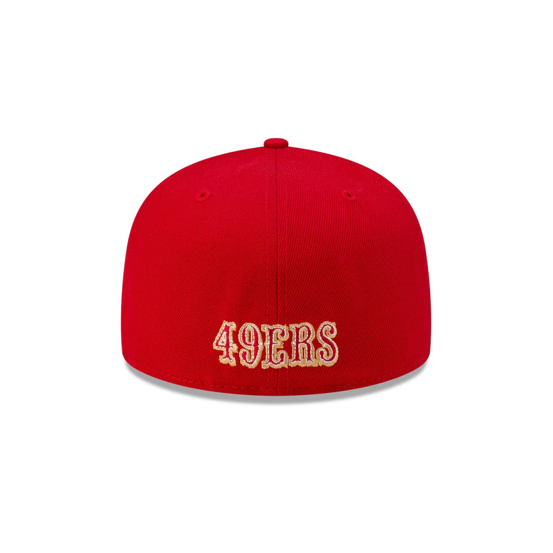 The San Francisco 49ers Black 59FIFTY Fitted features an embroidered 49ers logo at the front panels and an embroidered team script at the rear.